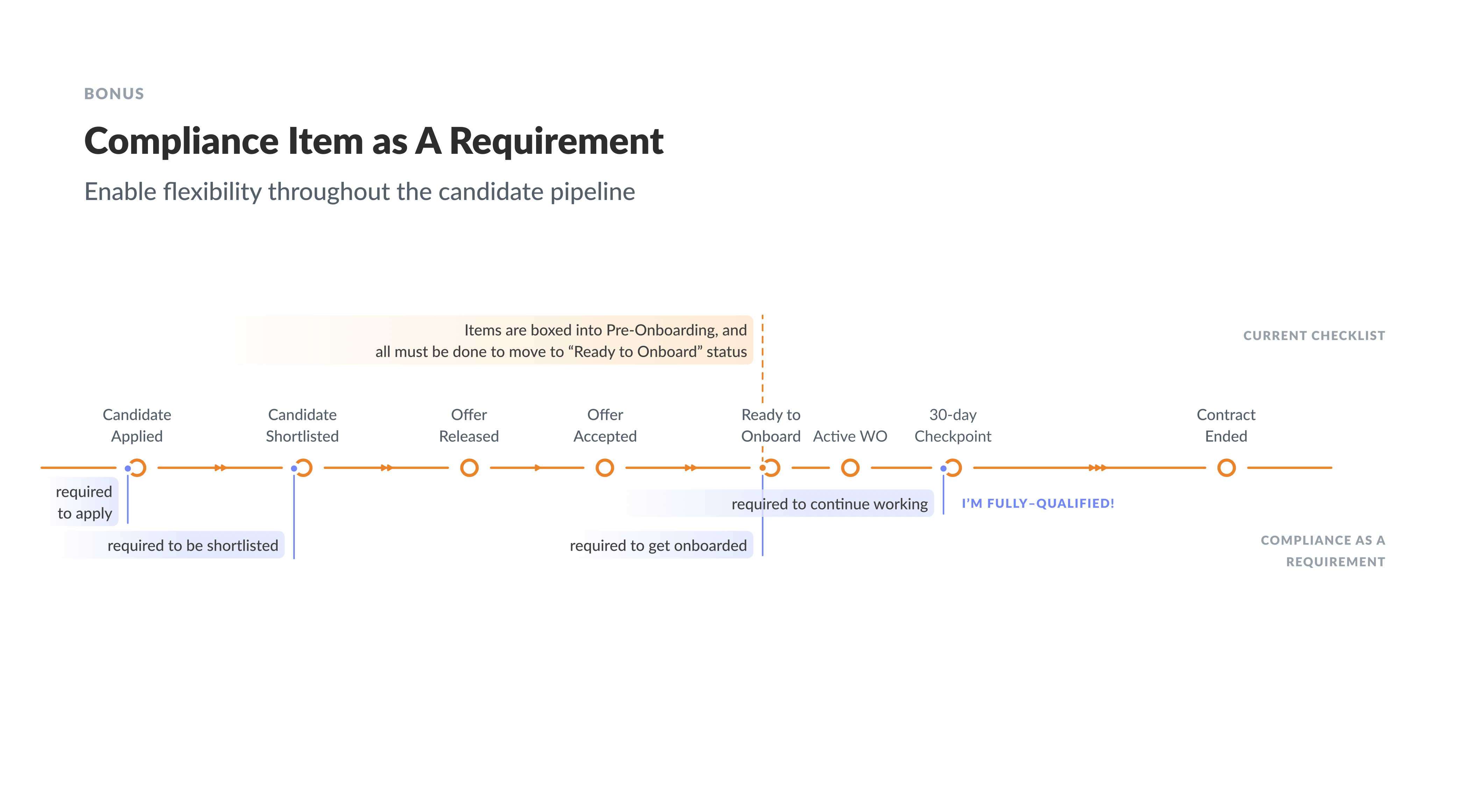 • A checklist will block a candidate from onboarding until they complete all required items. Customers valued this “blocking” feature the most from the existing Checklist product and wanted to have more of this throughout the workflow.